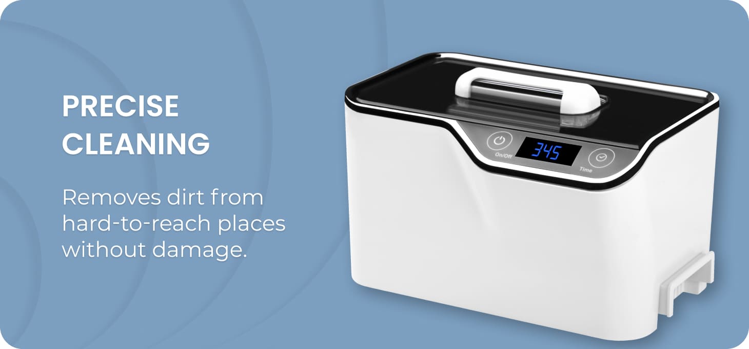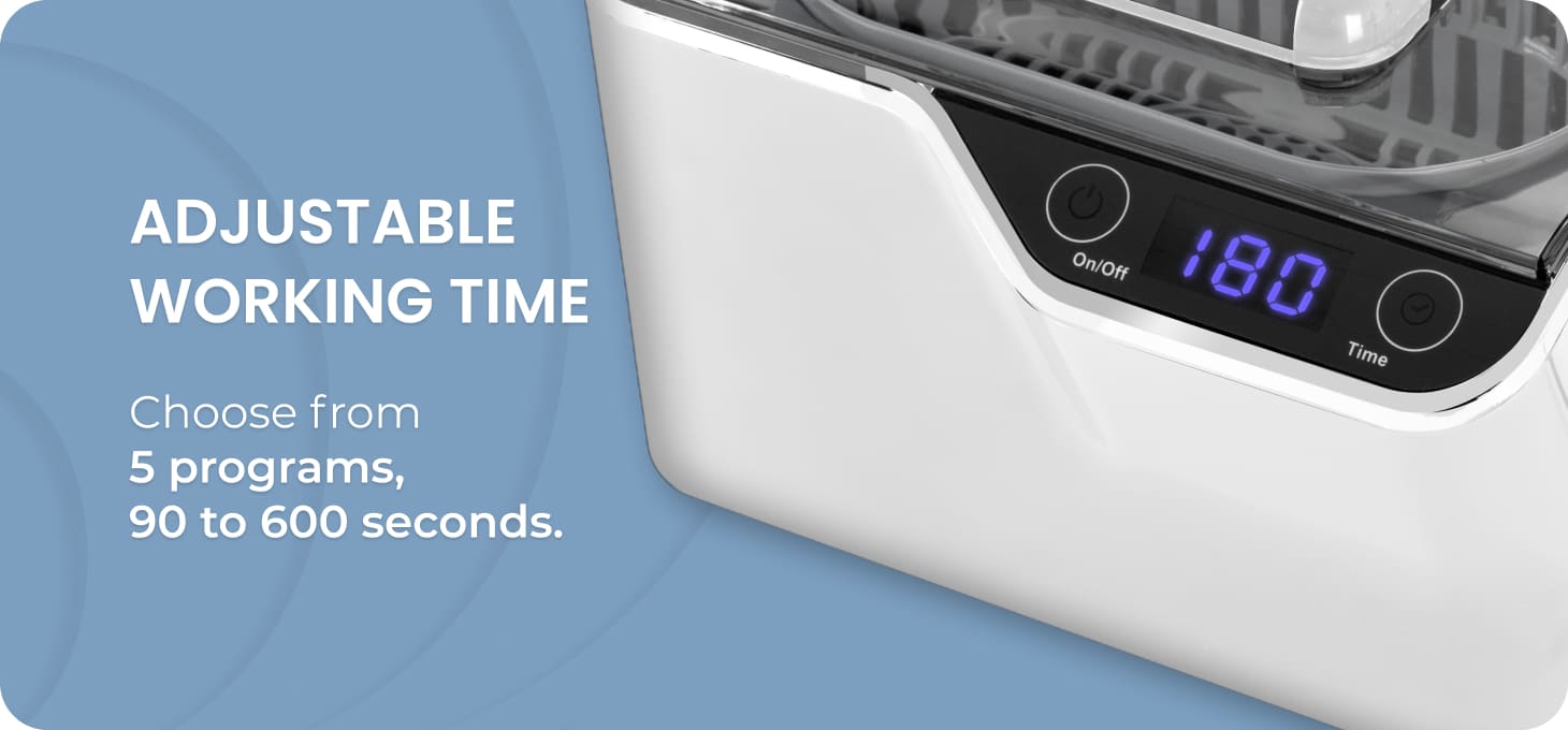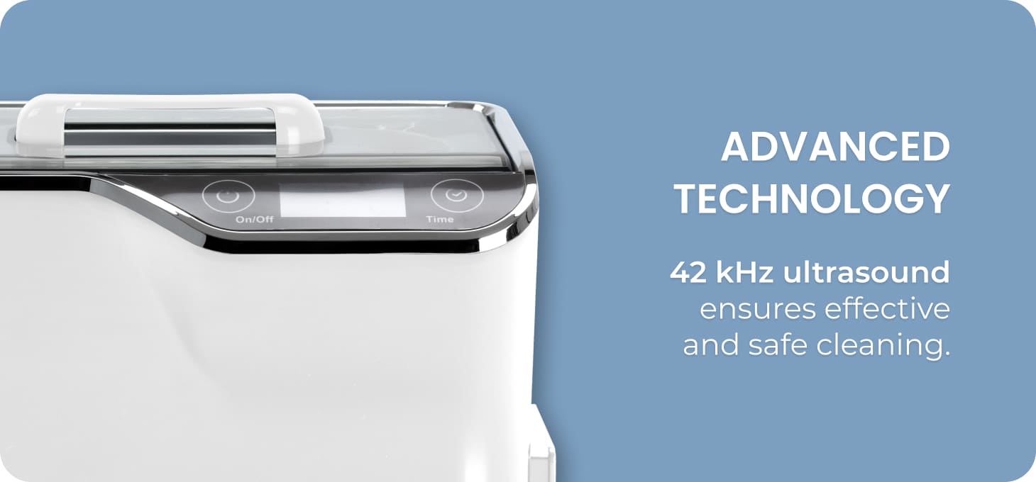 A practical display panel allows you to select one of five cleaning time settings – 90, 180, 300, 480 or 600 seconds – allowing you to customize the process to the type and degree of soiling. The 42 kHz ultrasonic frequency ensures thorough cleaning while maintaining the safety of delicate surfaces. To increase cleaning effectiveness, disinfectant fluids can be used, maintaining the concentrations recommended by the manufacturers.